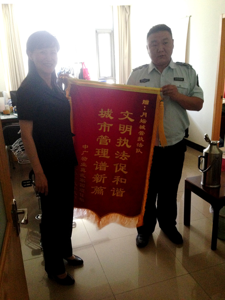 真武家園小區(qū)南門外長期有小販在此擺攤賣水果、蔬菜,給小區(qū)業(yè)主出入造成諸多不便,由于是在小區(qū)大門外,小販們對物業(yè)管理不配合。為此真武家園項目部將此情況上報月壇城管執(zhí)法隊,月壇執(zhí)法隊在短時間內就將長期在真武家園南門擺攤的小販們徹底清除。為了感謝月壇城管執(zhí)法隊對項目部工作的支持,2015年5月19日,真武家園項目部特向月壇城管執(zhí)法隊贈送錦旗“文明執(zhí)法促和諧,城市管理譜新篇”,以示感謝。