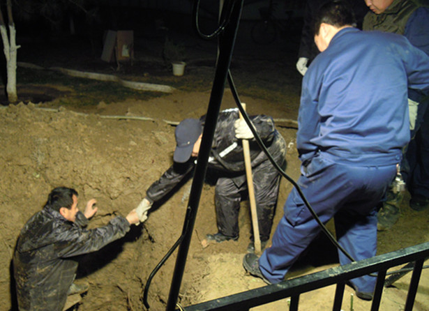 項目部將漏水和檢查情況上報公司領(lǐng)導(dǎo)后,公司領(lǐng)導(dǎo)果斷決定立即展開搶修,總工辦和項目部接到命令立即對現(xiàn)場漏水處進行開挖,公司總經(jīng)理黃建偉、副總經(jīng)理程建軍、公司顧問王保華高度重視親臨現(xiàn)場指導(dǎo),總工辦技術(shù)總監(jiān)李長青、住宅總監(jiān)畢建忠也親臨現(xiàn)場指揮,真武家園項目部陳寶松、楊雙玉、王兵、李文利、張慶元、王寶亮、陳勇、郭永忠、郭純良主動加班搶修,資料館項目部孟勇、央視住宅項目部呂東聞訊也主動加入到搶修工作中。