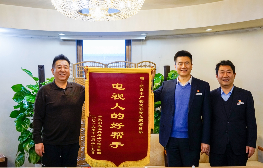 就在我們沉浸在雪天的喜悅中時(shí),《我們走在大路上》欄目組給我們送來了另外一份禮物--“電視人的好幫手”錦旗一枚,簡(jiǎn)短的幾個(gè)字寓意深刻,濃縮的是對(duì)我們細(xì)致周到服務(wù)的肯定和誠摯謝意。在受贈(zèng)儀式中,拍攝組導(dǎo)演代表整個(gè)創(chuàng)作團(tuán)隊(duì)跟臺(tái)行政處、管理科、公司領(lǐng)導(dǎo)合影留念,發(fā)言中,他講到,感謝影視之家項(xiàng)目部的服務(wù)團(tuán)隊(duì),感謝團(tuán)隊(duì)中每一位員工的辛勤付出,因?yàn)橛心銈兊膸椭秃笄诒U喜攀沟谜麄€(gè)片子畫上了一個(gè)圓滿的句號(hào),你們是真正的幕后英雄。