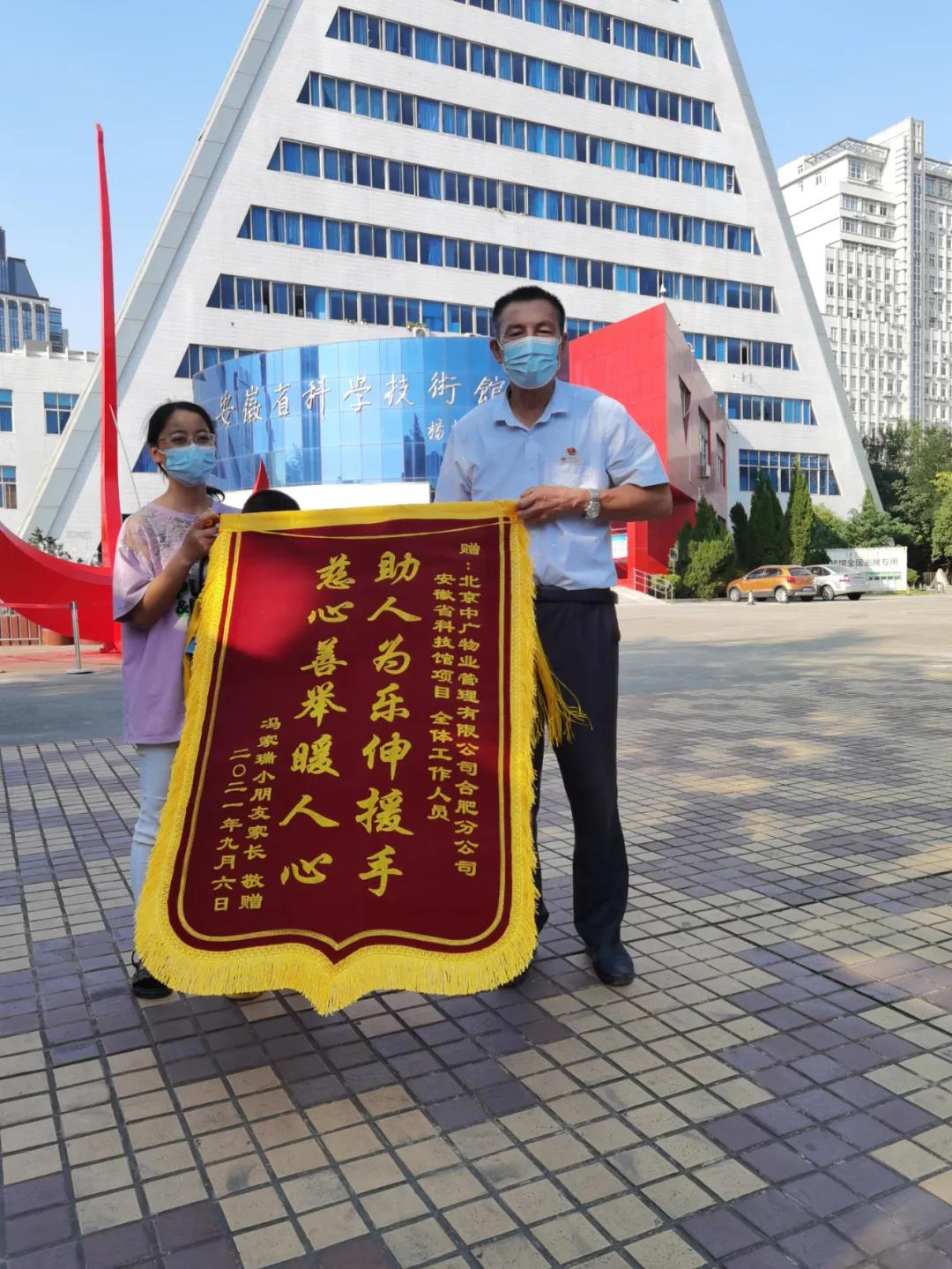 9月11日下午,北京中廣物業(yè)管理有限公司合肥分公司收到來自一位小朋友家長(zhǎng)“助人為樂伸援手,慈心善舉暖人心”錦旗,對(duì)安徽省科技館項(xiàng)目員工幫助找回走失的孩子表示衷心感謝。