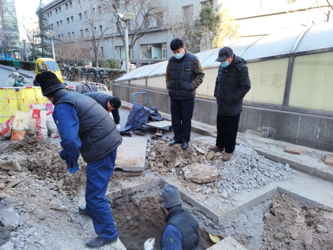 次日早8:00,項(xiàng)目部組織維修人員按照預(yù)定方案,布置好安全防護(hù)、警戒等措施后開始作業(yè),大家頂著凜冽的寒風(fēng)輪番開鑿地面、挖土方,于下午16:30找到了漏水點(diǎn)。但由于漏水點(diǎn)在暖氣管井底混凝土下,給搶修工作增添了難度,為了不破壞暖氣管井,減少停暖對(duì)住戶的影響,項(xiàng)目部及時(shí)調(diào)整搶修方案,決定采取管井外斷管,再敷設(shè)新管鑿?fù)ň谂c井內(nèi)管道連接的方案,并決定第三天再予以搶修。
