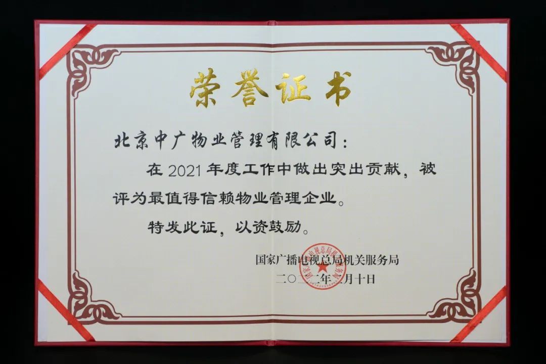 近日,在國家廣播電視總局機關(guān)服務(wù)局2022年度工作會議上,北京中廣物業(yè)管理有限公司連續(xù)第十二年獲“最值得信賴物業(yè)管理企業(yè)稱號”,公司總經(jīng)理崔立新代表公司上臺領(lǐng)獎。