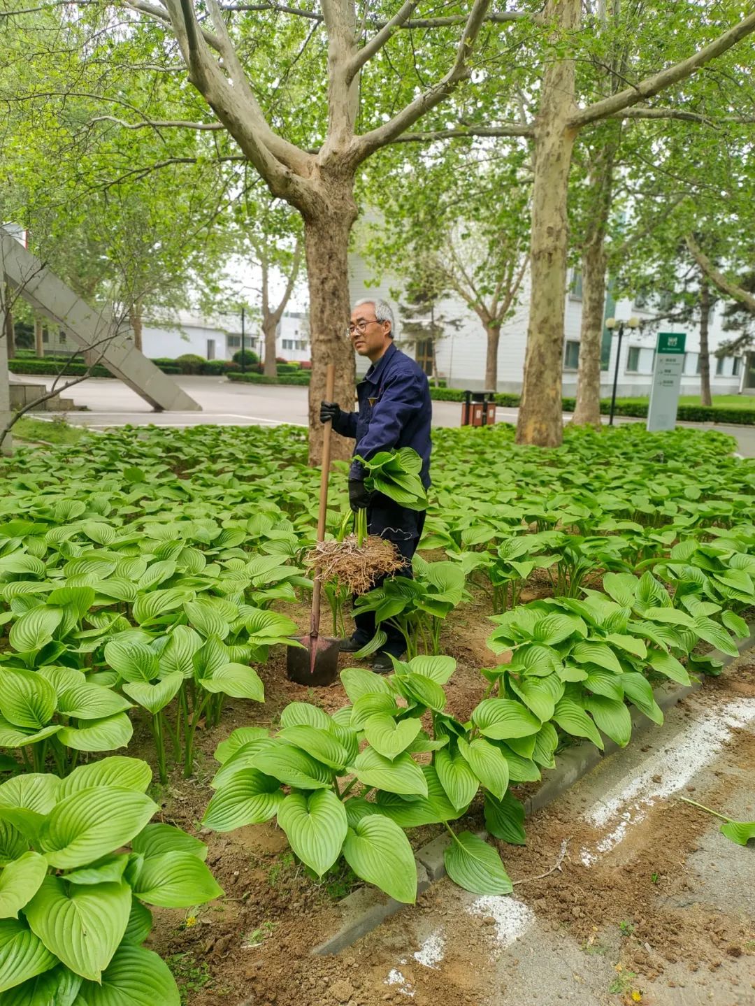 移植活動開始前,綠化專業(yè)人員即在綜合館東北角的“移栽區(qū)”清理雜草、翻整土地,為玉簪移植開拓場地以創(chuàng)造適宜的生存條件。隨著移植活動正式開始,男員工在綜合館西北側(cè)玉簪地進(jìn)行間苗,女員工將移出的玉簪搬運(yùn)至種植區(qū)。大家間苗的間苗、搬運(yùn)的搬運(yùn)、種植的種植,積極主動、相互配合、干的熱火朝天,用時約2個小時共計(jì)移植玉簪400余株,完成60平米的移栽工作。整個過程采用間苗、挖坑、放置玉簪、封土的流水線式作業(yè),最后澆水以提高成活率。