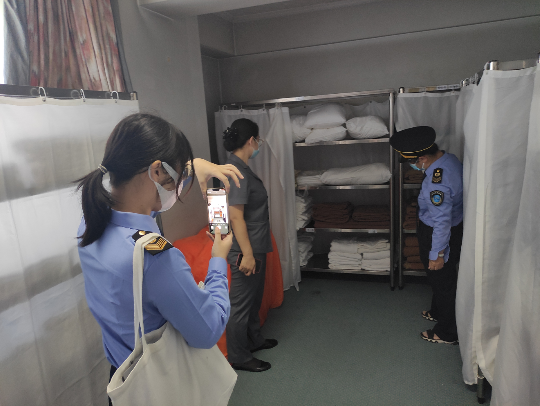 檢查組首先查驗(yàn)了影視之家項(xiàng)目部員工持健康合格證明上崗情況和健康證明公示情況,并檢查了顧客用品用具清洗、消毒、清潔的情況,一次性用品用具是否重復(fù)使用情況以及抽查了部分客用品是否符合行業(yè)衛(wèi)生要求。在美發(fā)室,檢查組針對(duì)消毒方式、消毒用具、消毒劑配比等情況進(jìn)行了隨機(jī)提問(wèn),項(xiàng)目部員工對(duì)答如流,得到了檢查組的充分肯定。同時(shí),檢查組對(duì)影視之家項(xiàng)目部布草間和消毒間嚴(yán)格按照規(guī)范存放布草(不銹鋼貨架離地10厘米,離墻面10厘米等),工具車分類明確、環(huán)境整潔給予高度認(rèn)可,并現(xiàn)場(chǎng)拍照留存,表示將作為轄區(qū)內(nèi)其他酒店的工作示范標(biāo)準(zhǔn)。