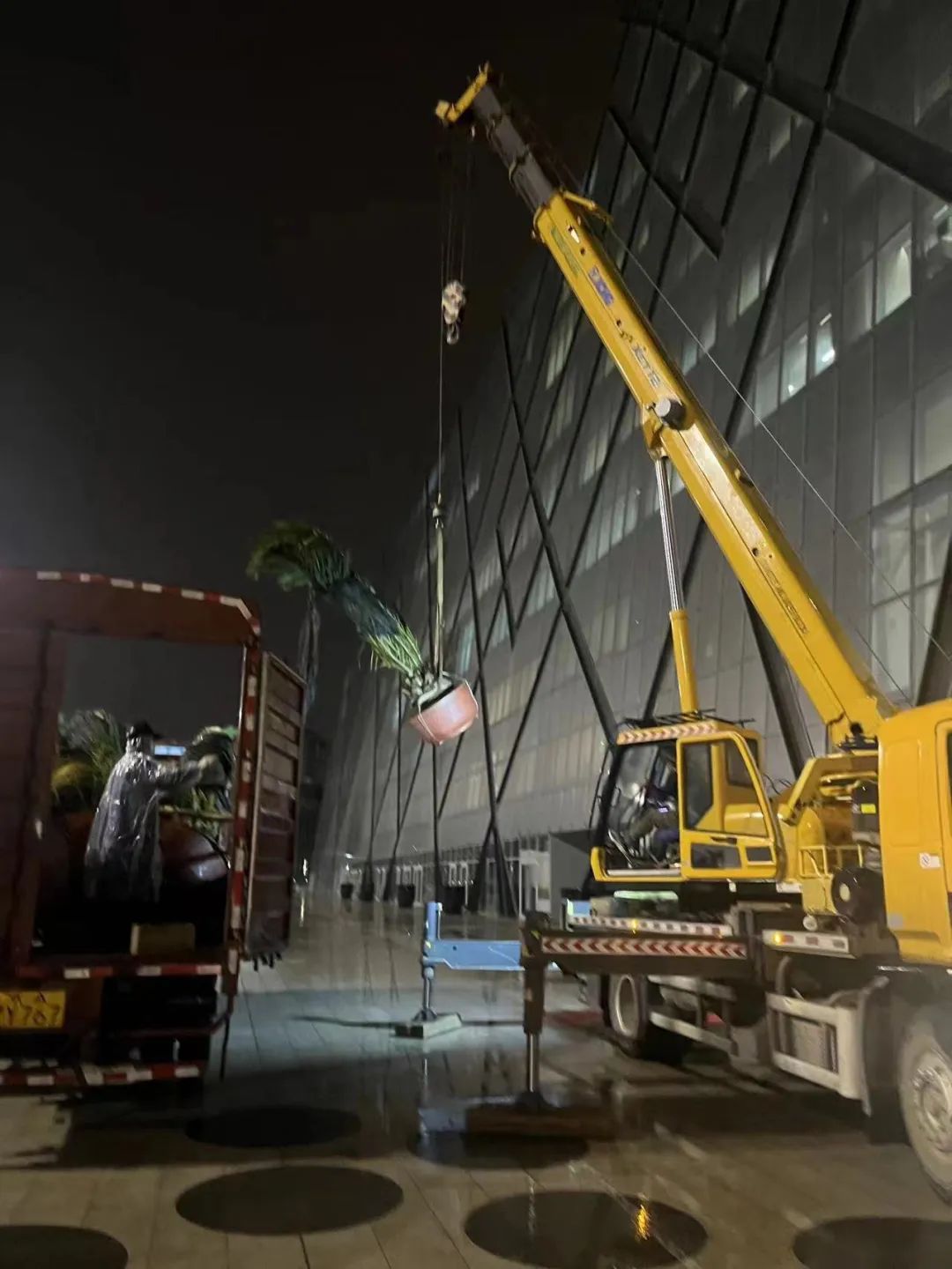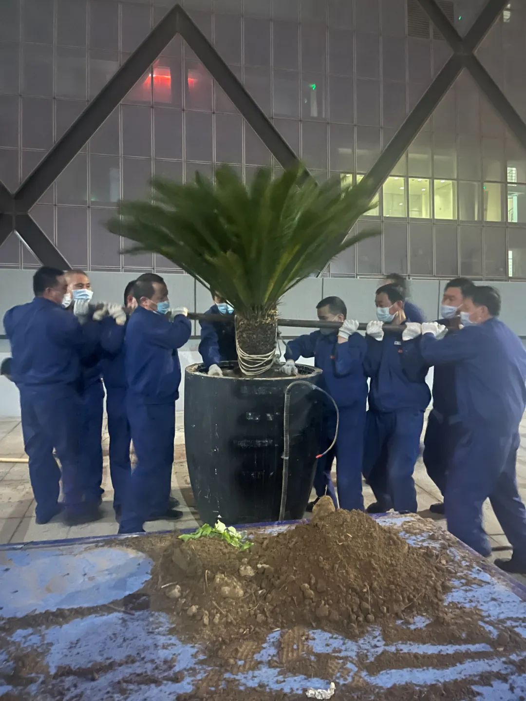 為盡可能將大型盆栽季節(jié)性更換工作對總臺辦公區(qū)域影響降低,同時方便綠植運(yùn)輸及吊運(yùn)車輛進(jìn)出,公司決定利用夜間辦公人員相對較少時段進(jìn)行作業(yè)。公司領(lǐng)導(dǎo)及相關(guān)部門負(fù)責(zé)人親臨現(xiàn)場督導(dǎo)協(xié)調(diào),從傍晚六點(diǎn)至次日凌晨三點(diǎn),共計出動員工20余人,大家不顧深夜低溫,冒雨進(jìn)行吊裝、轉(zhuǎn)運(yùn)、種植、加固等操作,最終將光華路辦公區(qū)主樓外圍7棵海藻樹和15棵鐵樹種植完成,并將近4米高的22棵云杉樹重新轉(zhuǎn)運(yùn)移栽至總臺指定地點(diǎn)進(jìn)行養(yǎng)護(hù),為冬季景觀打造奠定堅(jiān)實(shí)基礎(chǔ)。